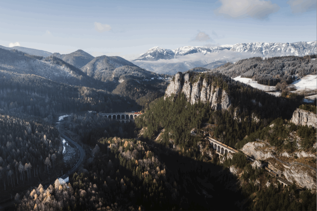 En Autriche, à 1 h30 de train de la gare centrale de Vienne, la ligne du Semmering est un monument ferroviaire exceptionnel. Elle est d’ailleurs la toute première ligne de chemin de fer de montagne à voie normale de l’histoire et est inscrite au patrimoine mondial de l’UNESCO depuis 1998.